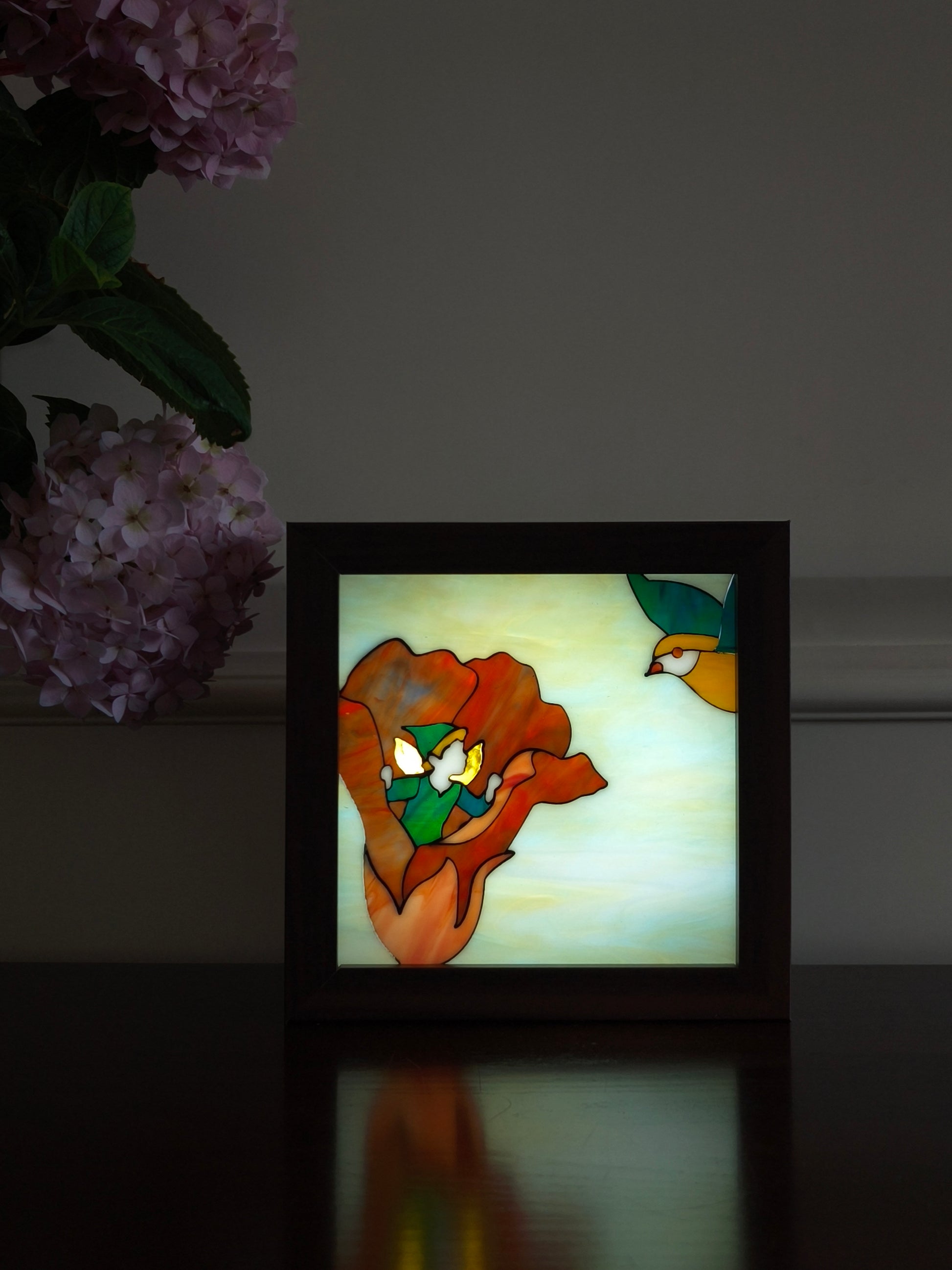Each Fairiven night light is hand-assembled using traditional stained glass techniques. Colored glass pieces are individually cut and embedded with care, forming a glowing scene that flickers like a living memory.